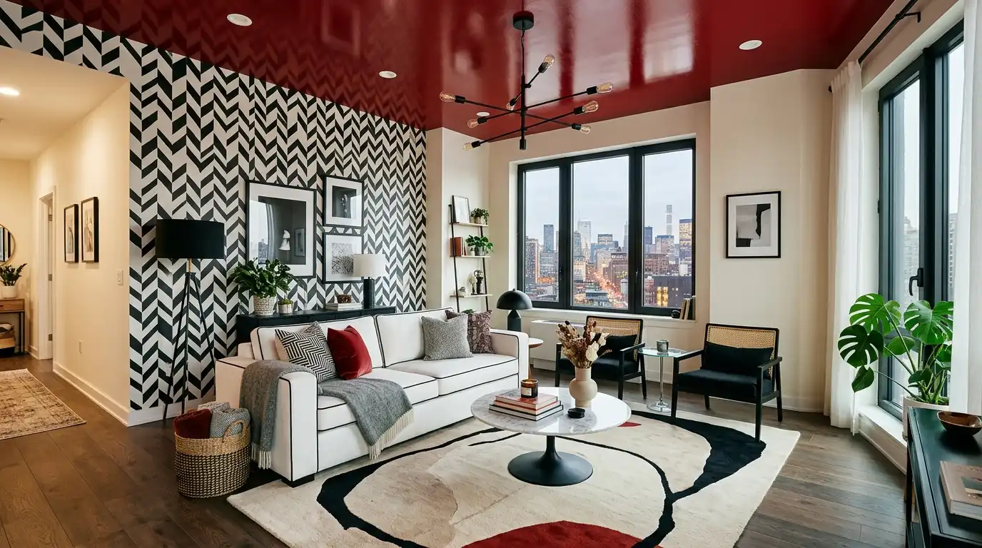 Set a white tuxedo-style sofa against a black-and-white patterned wallpaper. Use black velvet piping on the white cushions to create a sharp, graphic “frame” that mirrors the architectural lines of a modern maximalist apartment.