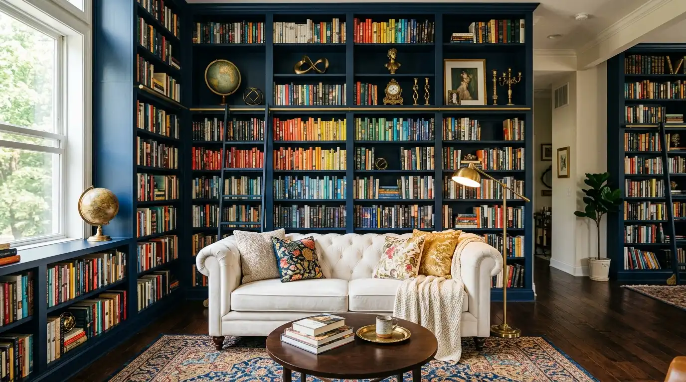 Flank a white velvet sofa with floor-to-ceiling bookshelves packed with thousands of colorful books and curios. The white fabric acts as a neutral bridge between the two dense “walls of knowledge,” keeping the seating area feeling airy and open.