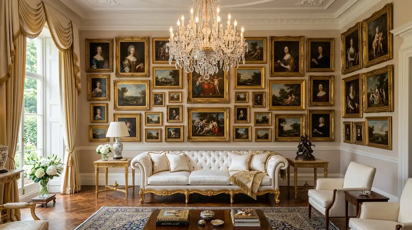 Place a formal white silk-upholstered sofa beneath a massive, floor-to-ceiling gallery of ornate gilt-framed oil paintings. The white silk reflects the golden glow of the frames, creating a regal, museum-like atmosphere of “old-world” maximalism.