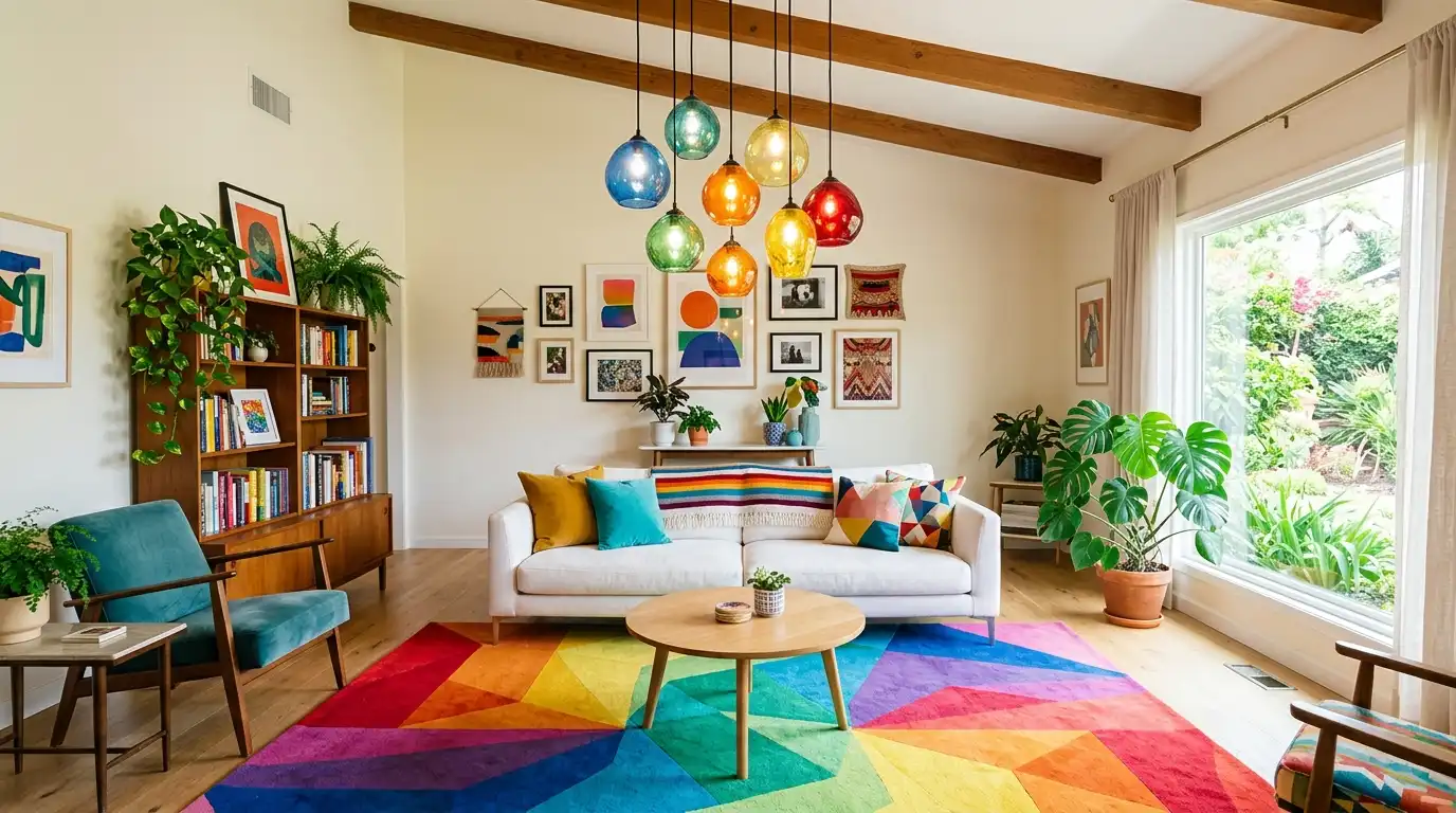 Use a white sofa to anchor a room featuring a large-scale, multi-colored geometric “prism” rug. Because the sofa is neutral, you can pull every color from the rug into different accessories—like vases and lamps—without the colors competing for attention.