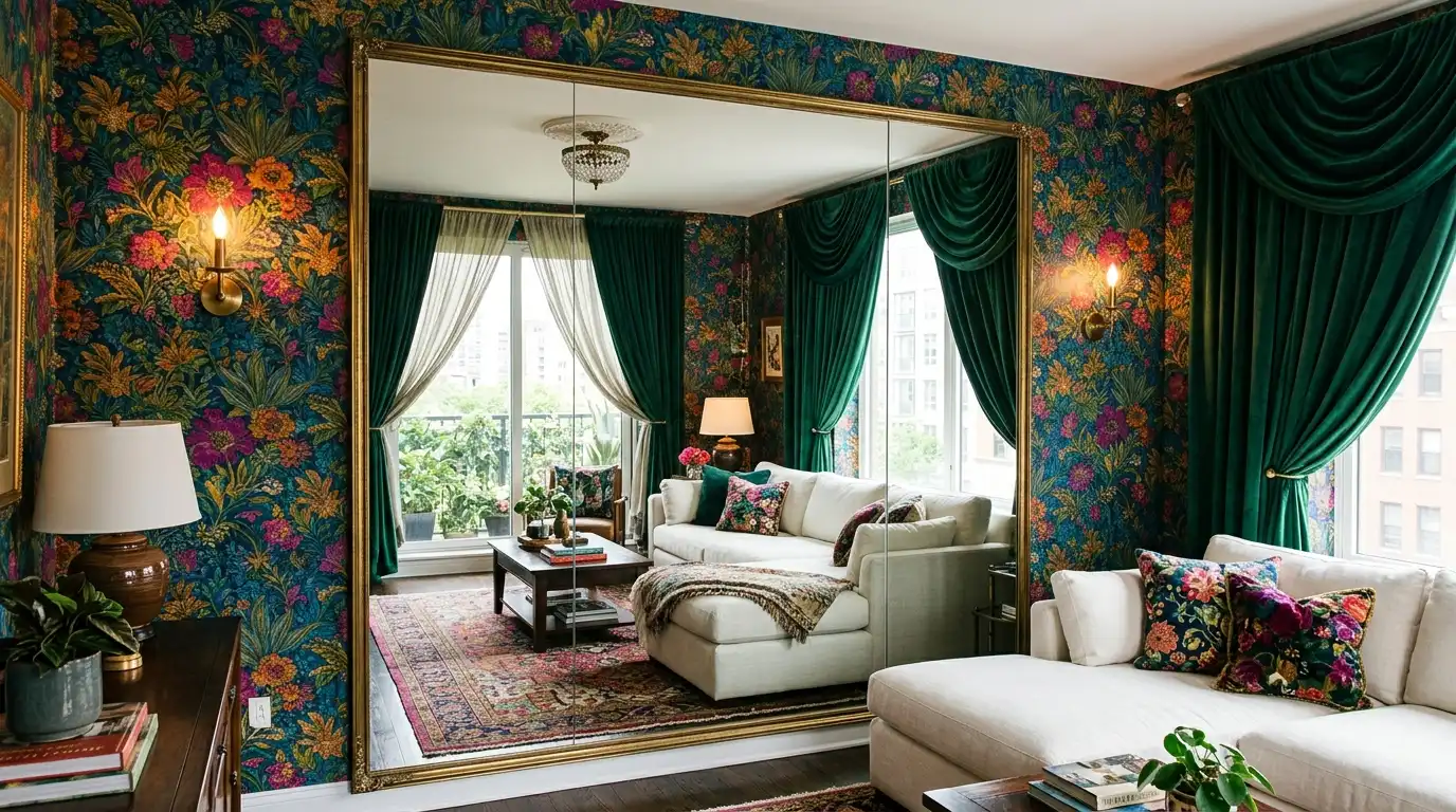 Position a white sofa in front of a large mirrored wall featuring an additional ornate mirror mounted on top. The white fabric is reflected infinitely, amplifying the light in a room packed with dark patterns and heavy textures.