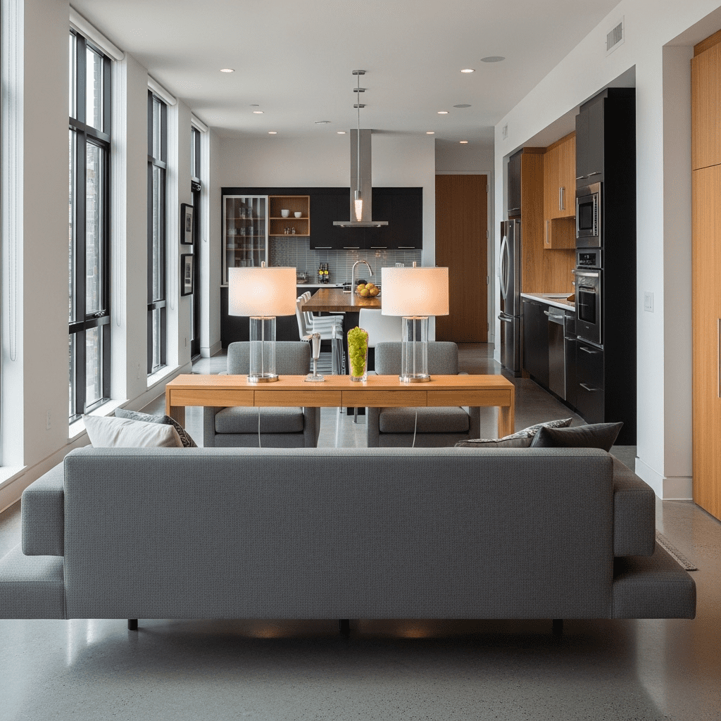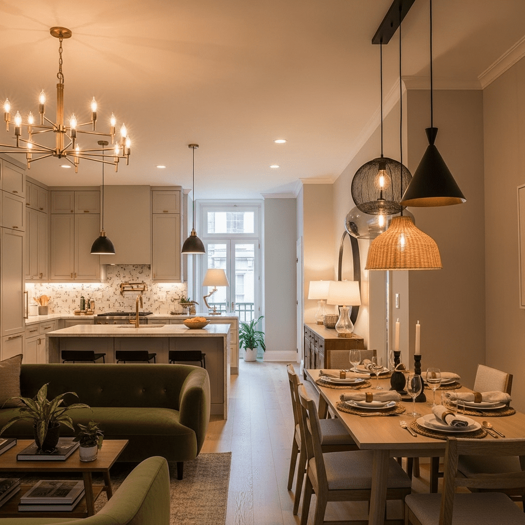 Install a statement chandelier or pendant over seating area, separate pendants over dining, and recessed lighting in kitchen. The varied lighting creates psychological zones while maintaining openness.