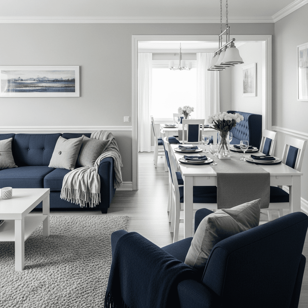 Choose 3-4 colors and repeat them in living, dining, and kitchen areas. This creates unity while distinct furniture arrangements define separate functions. The coordinated palette makes everything feel larger.