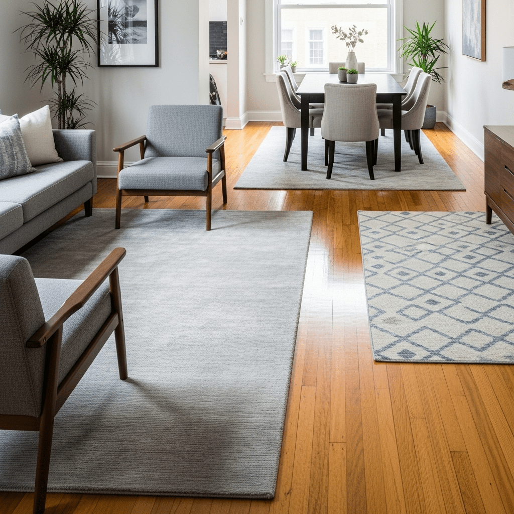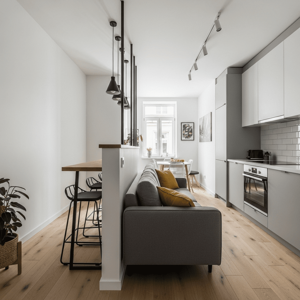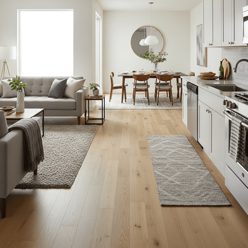 Use one flooring type—hardwood, tile, or vinyl plank—throughout living, dining, and kitchen. This creates visual continuity that makes narrow spaces feel larger. Use rugs to define zones instead of different flooring.