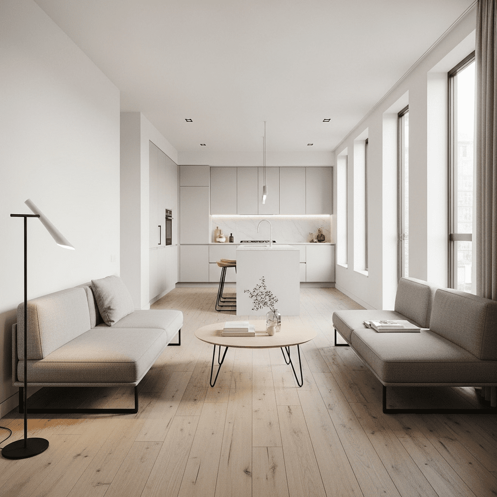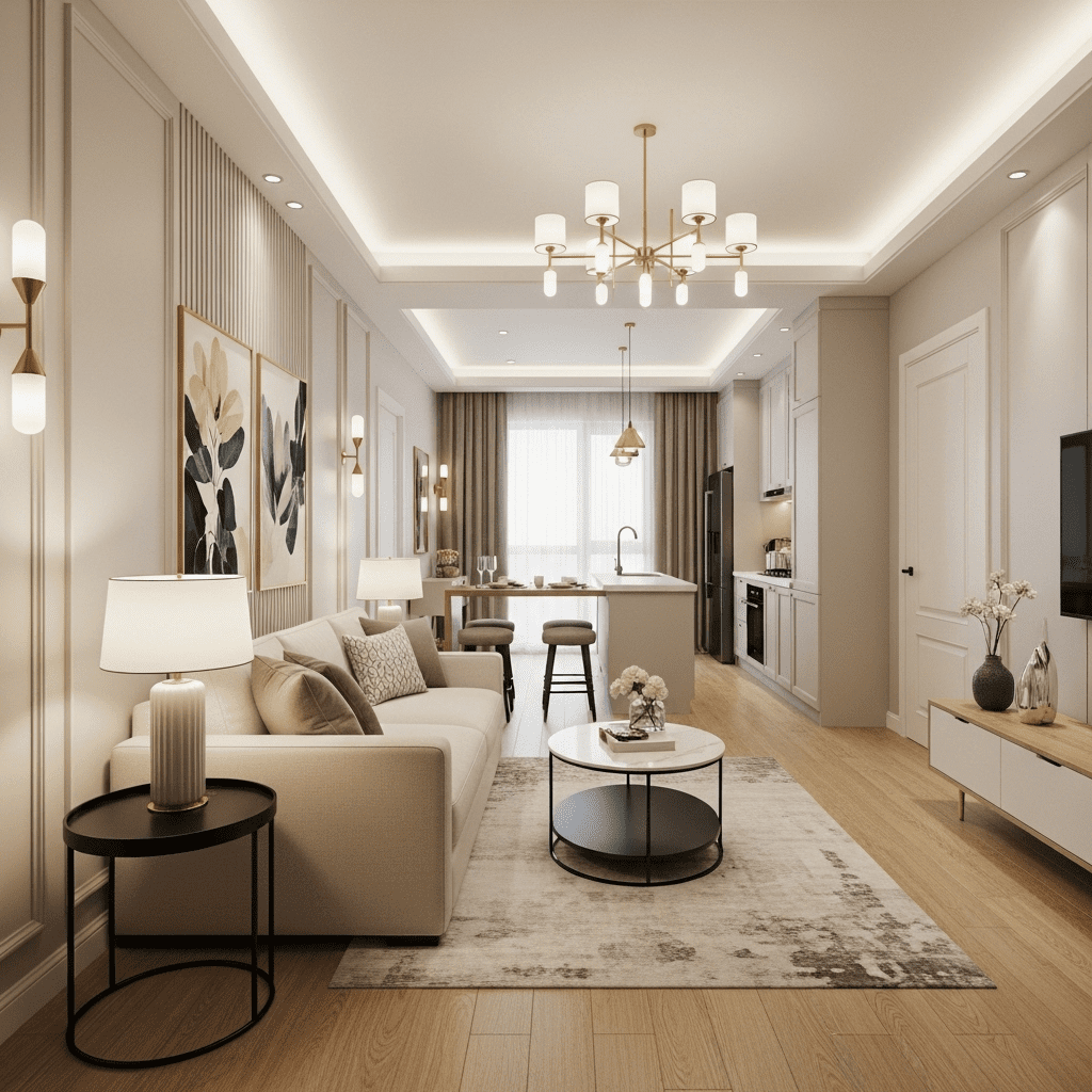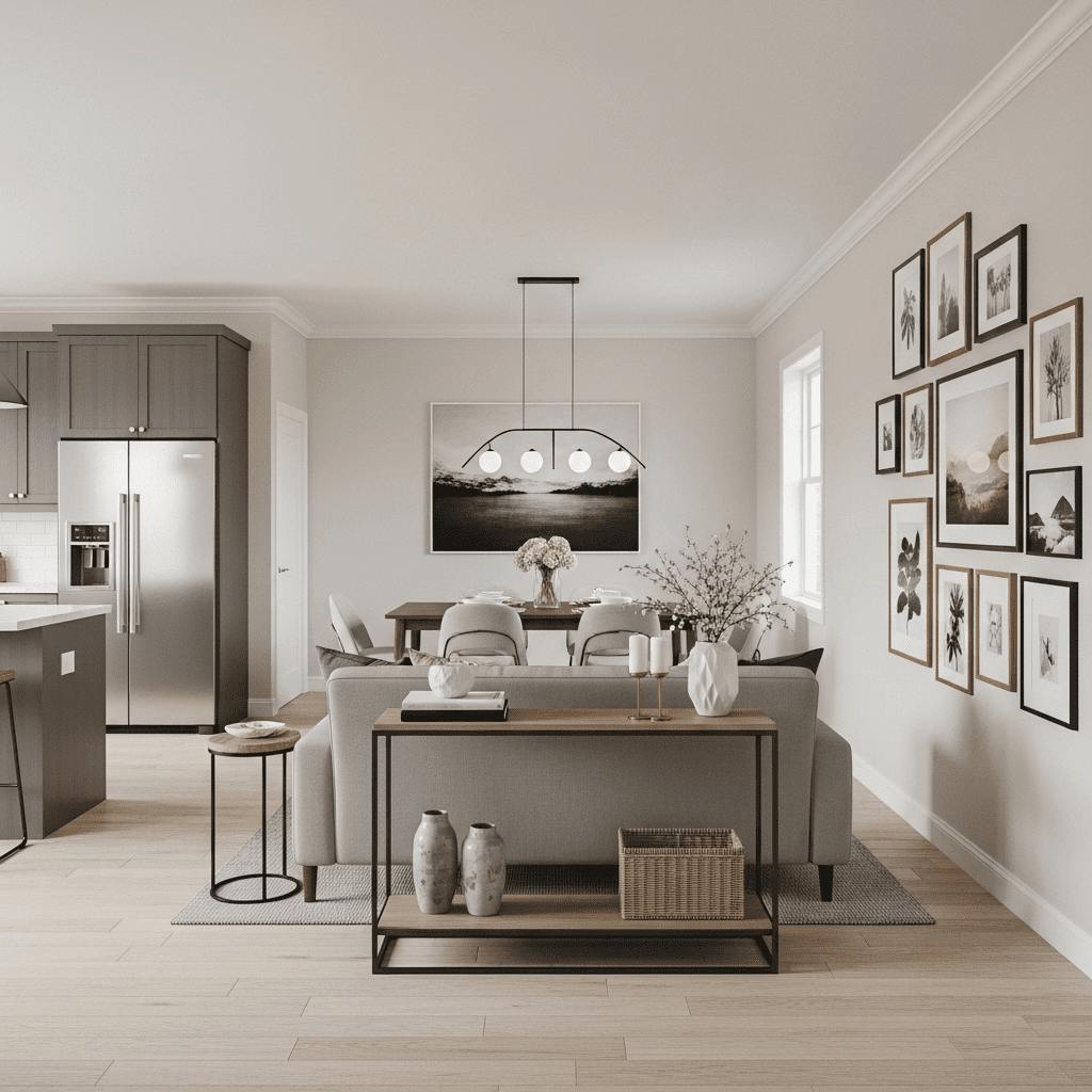Use one flooring type—hardwood, tile, or vinyl plank—throughout living, dining, and kitchen. This creates visual continuity that makes narrow spaces feel larger. Use rugs to define zones instead of different flooring.