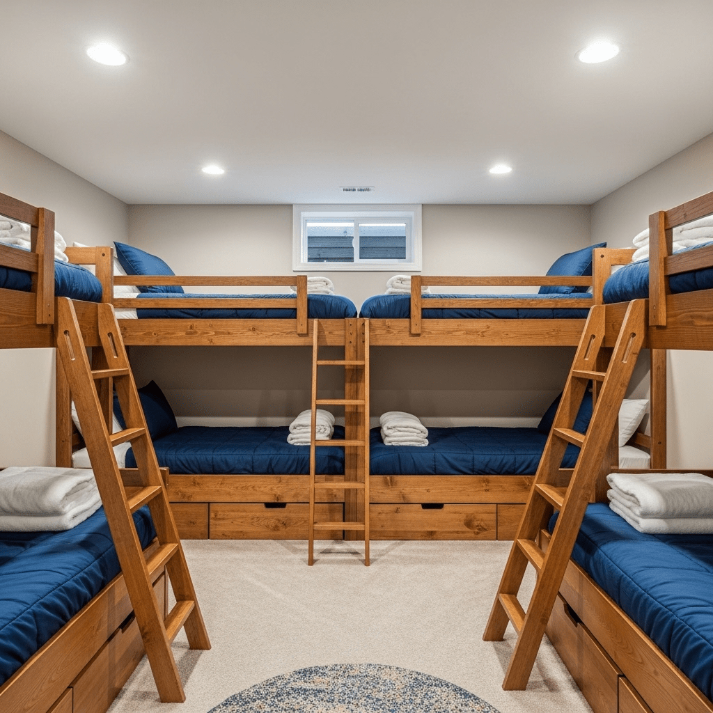 Basements are ideal for maximizing sleeping capacity. Custom-built bunk beds with individual reading lights and privacy curtains turn a small basement corner into a high-capacity guest zone for families.