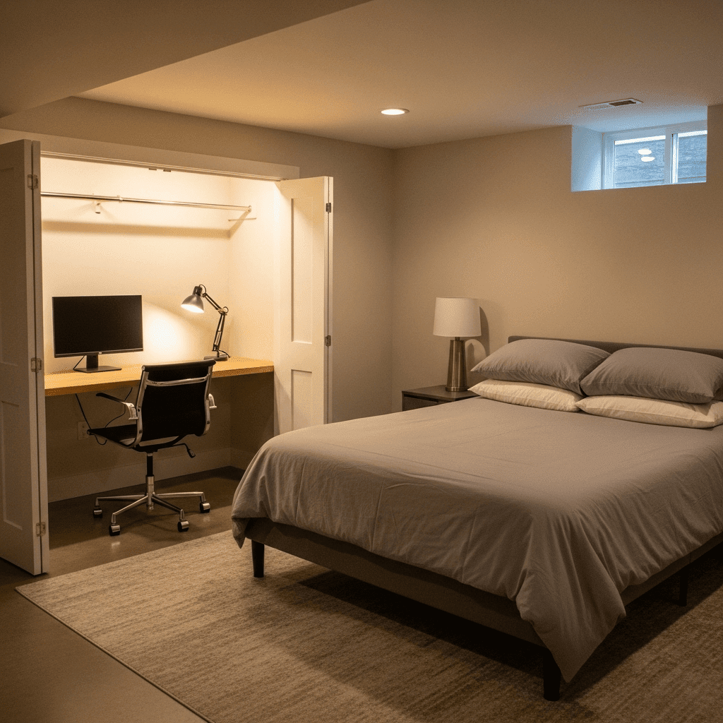 Basements often lack closet space. A raised platform bed with built-in drawers underneath provides ample storage for guest luggage and extra linens without needing extra furniture.