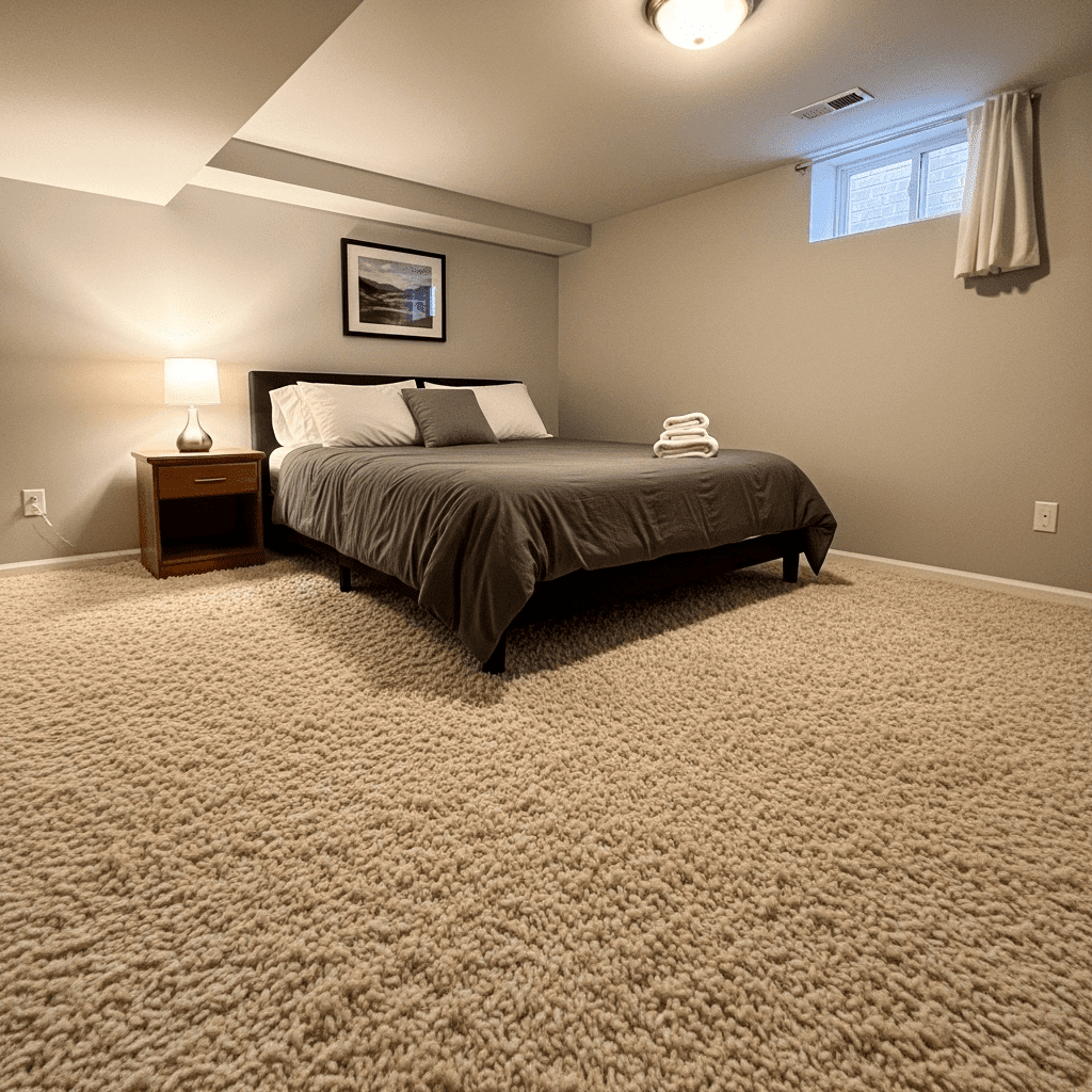 Since basement floors can be cold, a wall-to-wall plush carpet or a massive high-pile area rug is essential. It adds warmth and significantly improves the room’s soundproofing.