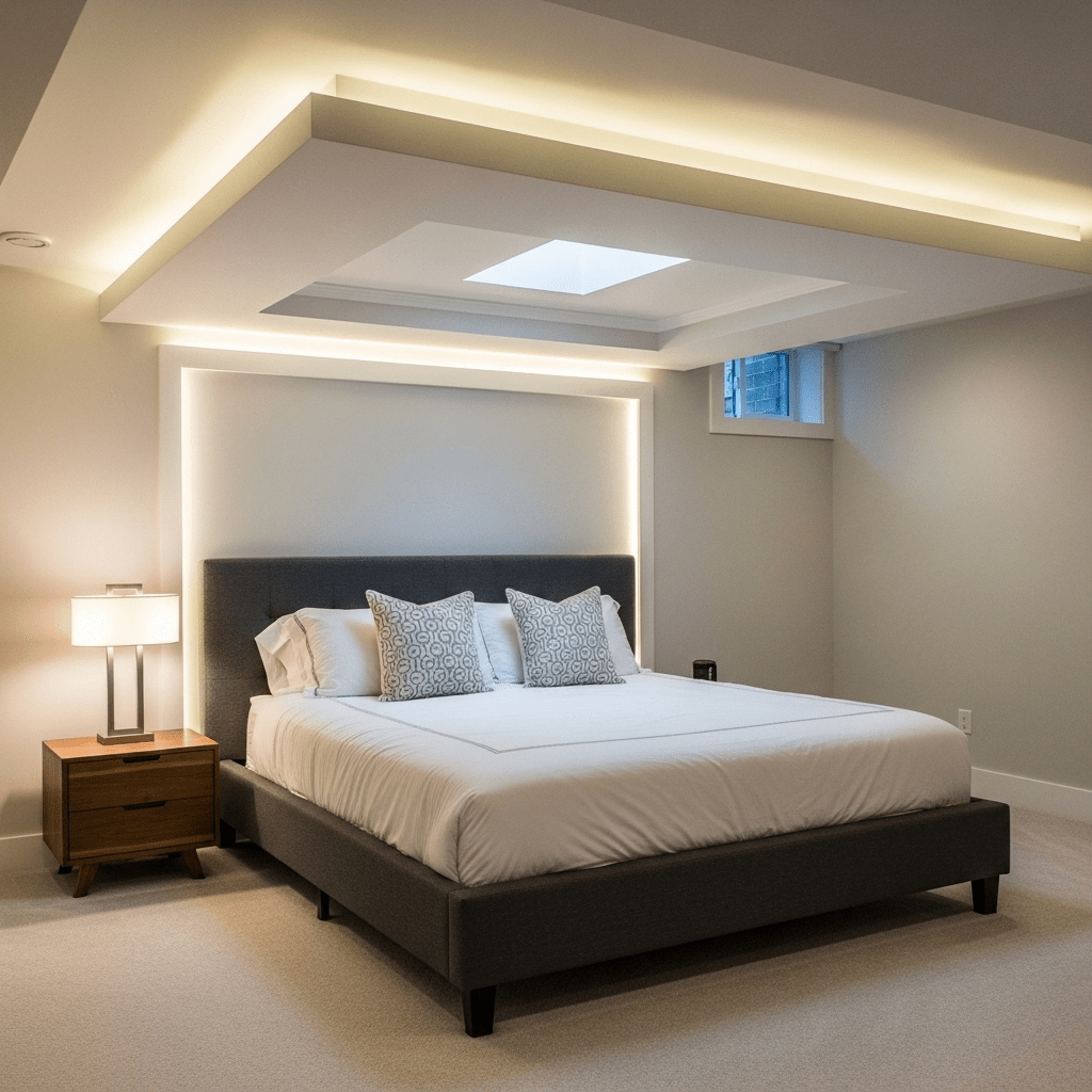 Elevate low basement ceilings by adding a recessed tray ceiling with “cove” lighting. This adds vertical depth and provides a soft, indirect light source that feels more natural than pot lights.
