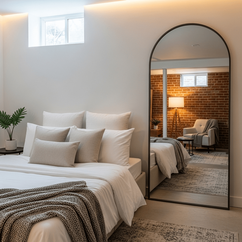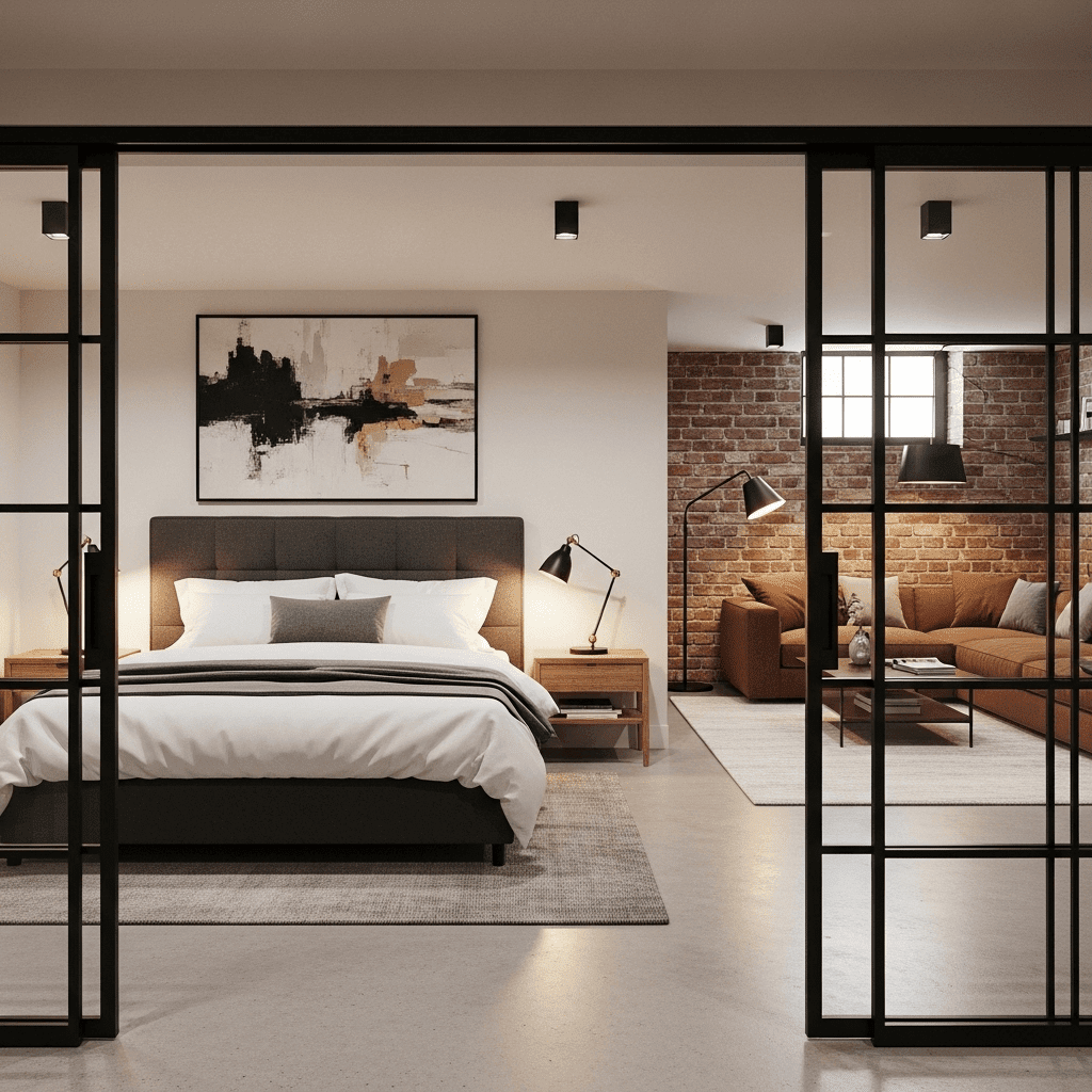 If the basement is a large open studio, use black-framed glass partitions to define the sleeping area. This keeps the space feeling open while providing a clear “guest room” boundary.
