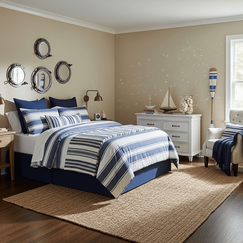 Use the subterranean location to your advantage with a nautical theme. Brass porthole mirrors, navy stripes, and rope details make the basement feel like a luxury cabin on a high-end ship.