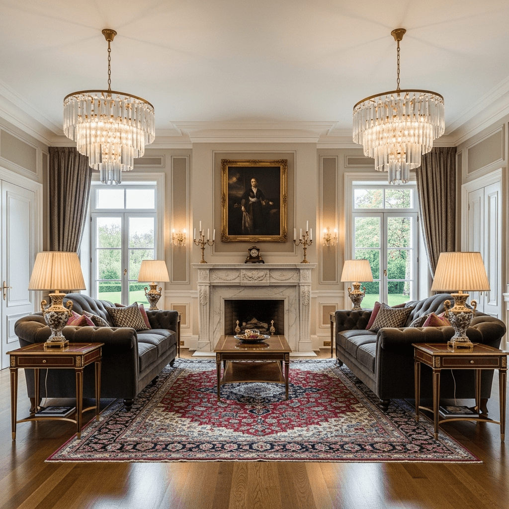 Classical symmetry brings order to large spaces beautifully. Twin sofas flanking a central fireplace, matching side tables, paired lamps, and mirrored architectural elements create balanced, formal grandeur that suits traditional estates and formal entertaining perfectly.