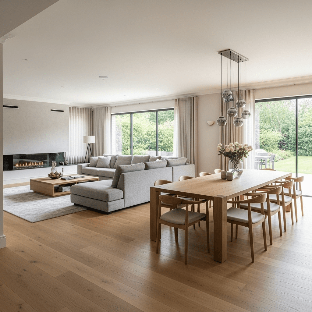 Merge living, dining, and sometimes kitchen areas into one continuous flowing space. Consistent flooring, unified color palettes, and strategic furniture placement define zones without walls, creating the ultimate entertaining environment across generous square footage.