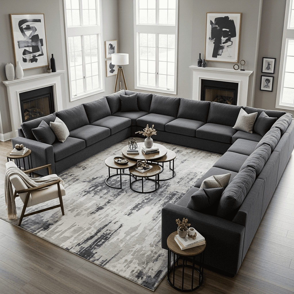One enormous L-shaped or U-shaped sectional commands the center of large rooms, providing abundant seating while creating visual anchor proportional to the space. This bold furniture choice prevents large rooms from feeling empty or underfurnished.