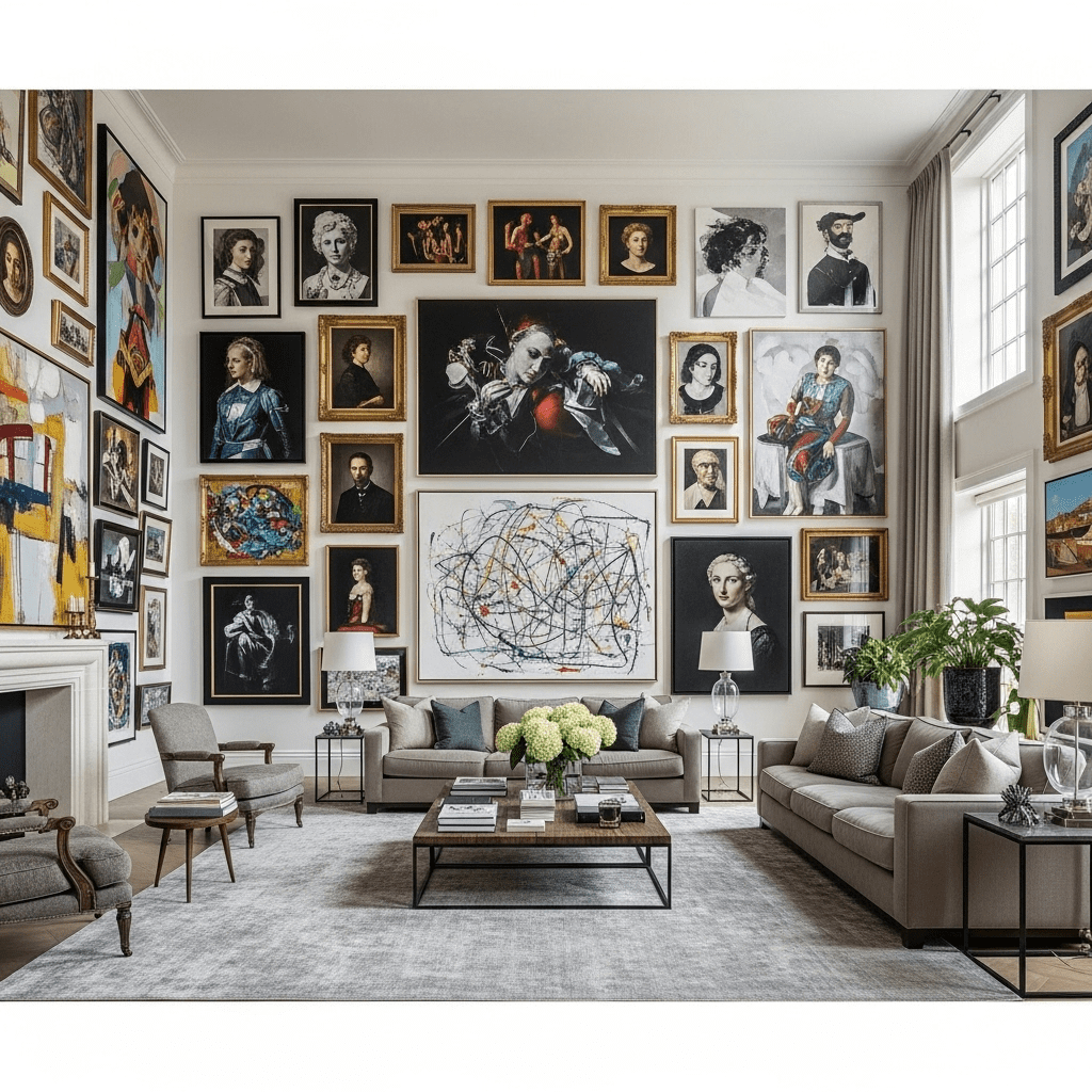 Floor-to-ceiling gallery walls spanning entire expansive walls create visual interest proportional to large spaces. Mix artwork sizes generously—nothing timid works in big rooms—creating museum-quality displays that celebrate the vertical and horizontal space available.