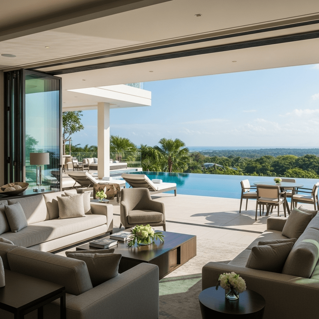 Disappearing glass walls merge interior living rooms with outdoor terraces, pools, or gardens. This approach effectively doubles perceived space while creating resort-style living that celebrates generous square footage magnificently.