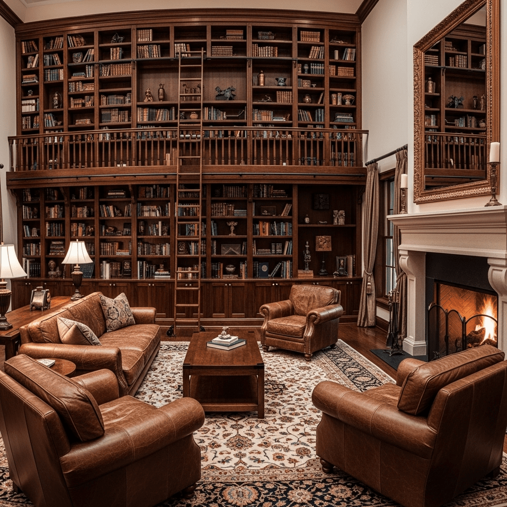 Floor-to-ceiling built-in bookshelves spanning entire walls bring warmth and intellectual character to large living rooms. Thousands of books create visual richness while the enclosing shelves prevent the cavernous feeling large spaces sometimes suffer.