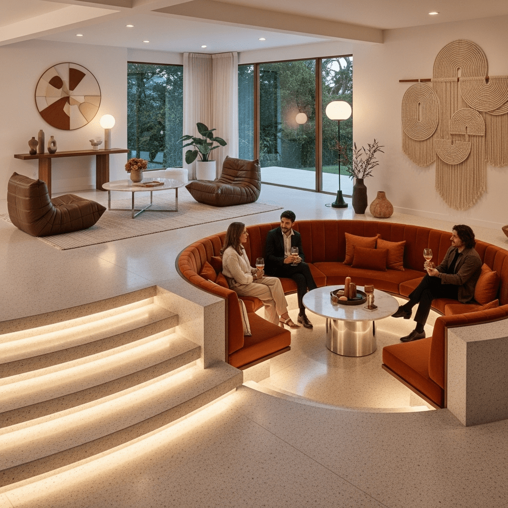 Sunken conversation pits create intimate gathering spaces within larger room contexts. Steps descending into cozy seating areas surrounded by built-in banquettes generate warmth and connection despite the room’s overall generous proportions.