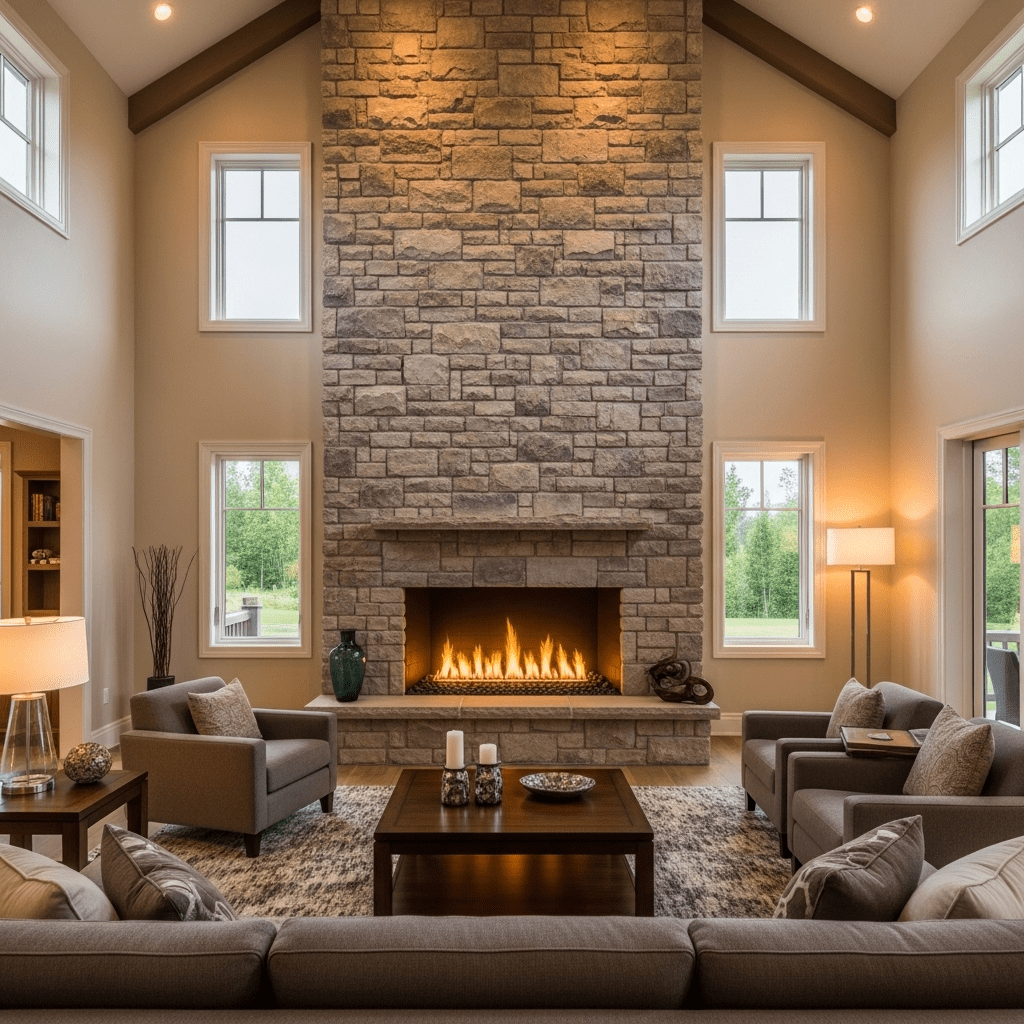 Massive floor-to-ceiling fireplaces appropriate to large room scale create dramatic focal points that command attention deservedly. Stone, marble, or modern linear designs sized generously anchor spaces while providing both visual and literal warmth.