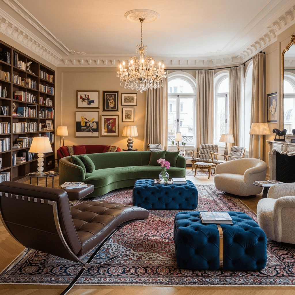 Combine diverse seating—sofas, chaise lounges, armchairs, ottomans, benches—throughout large rooms. This variety creates visual interest while accommodating different activities and preferences within the generous space available.
