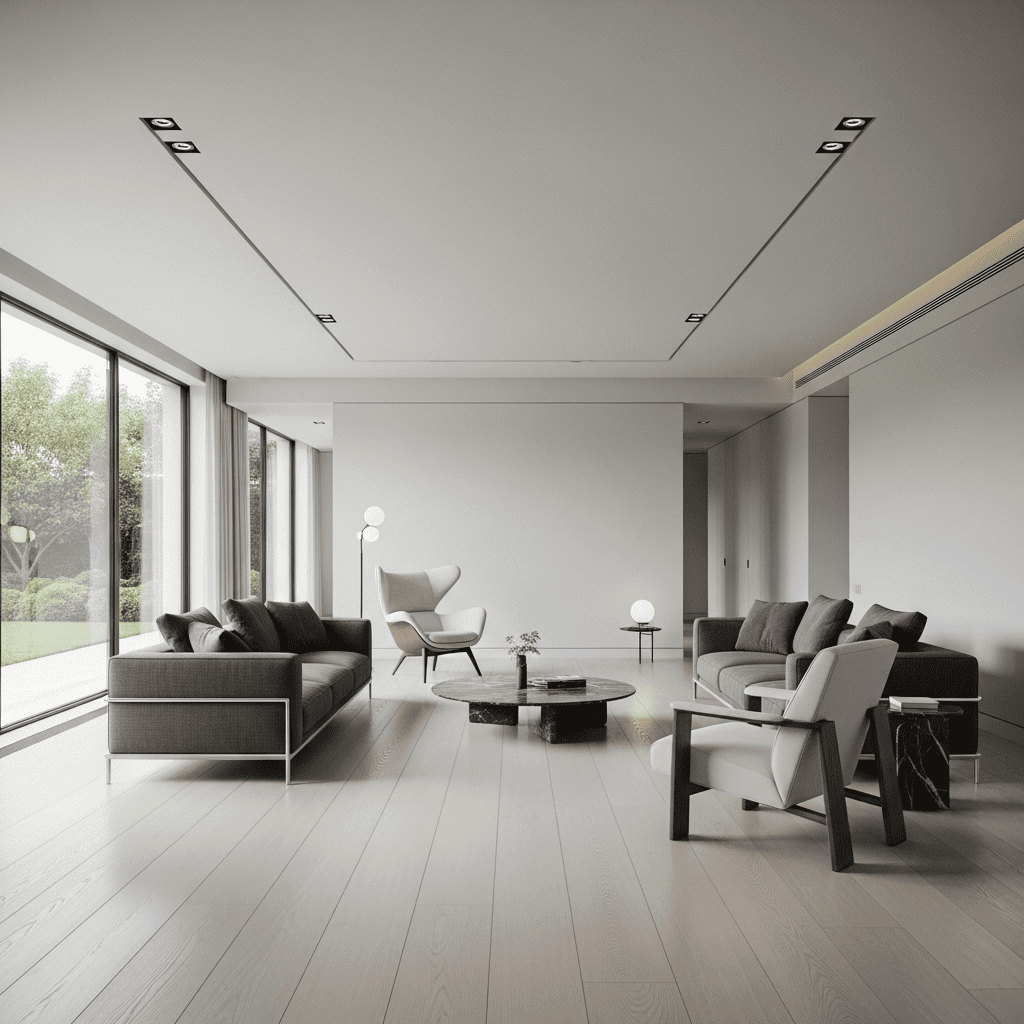 Embrace emptiness deliberately in large rooms through minimalist design. Carefully selected, exceptionally beautiful furniture pieces separated by generous breathing room create serene, gallery-like living rooms where space itself becomes the luxury.