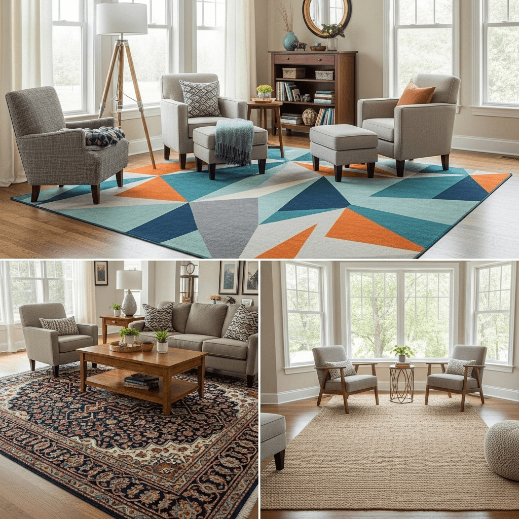 Embrace Multiple Rugs: Single rugs rarely work in truly large rooms. Layer multiple rugs defining different zones, or choose rugs sized generously enough to anchor furniture groupings properly—all furniture legs on the rug, not just front legs touching edges.