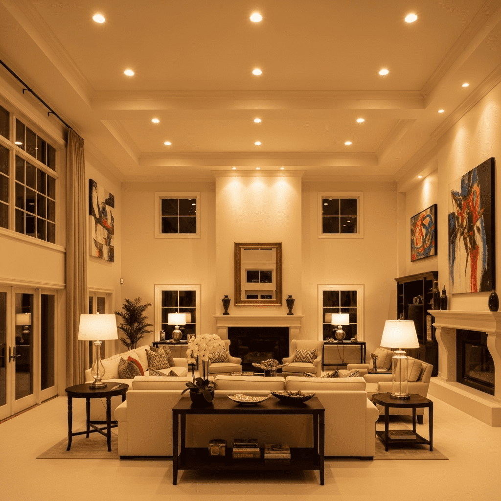 Large rooms demand complex lighting schemes—ambient overhead, multiple table and floor lamps, accent lighting, architectural lighting—all working together. This layering prevents dark corners while creating warm, inviting atmosphere throughout expansive footage.