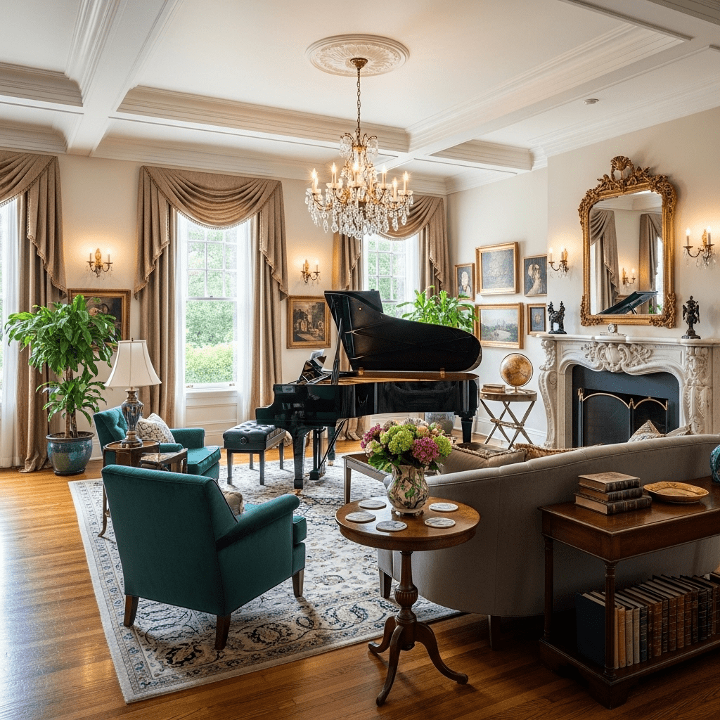A grand piano provides both functional musicality and impressive visual presence proportional to large living rooms. This classic furniture piece fills space beautifully while adding cultural sophistication and conversation-starting presence.