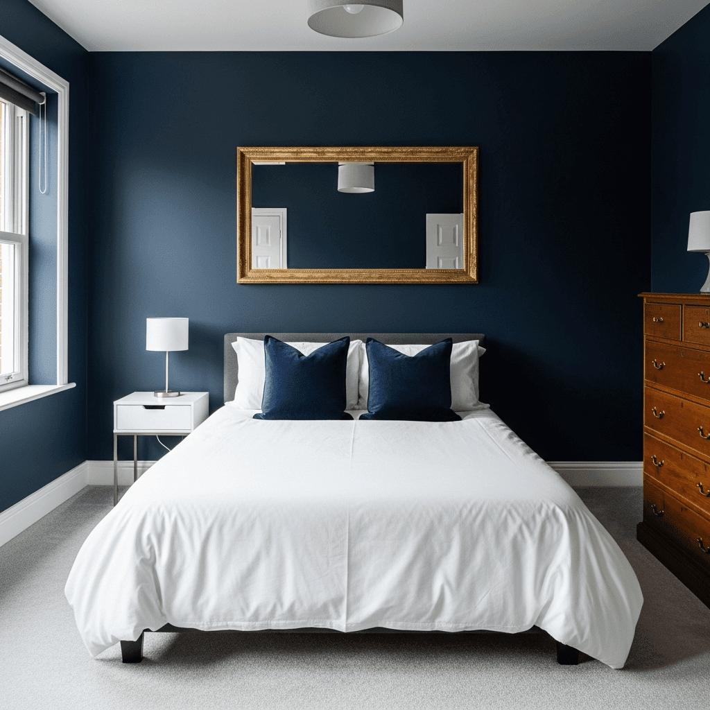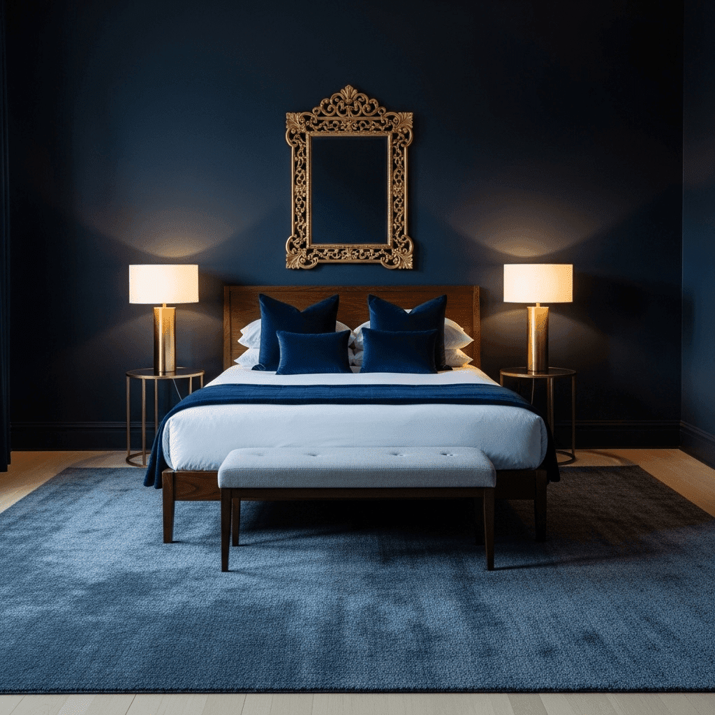 A deep, dark navy provides a sophisticated backdrop that feels incredibly high-end. When paired with polished gold or brass accents, the room transforms into a regal, boutique-style suite that feels expensive and intentional.