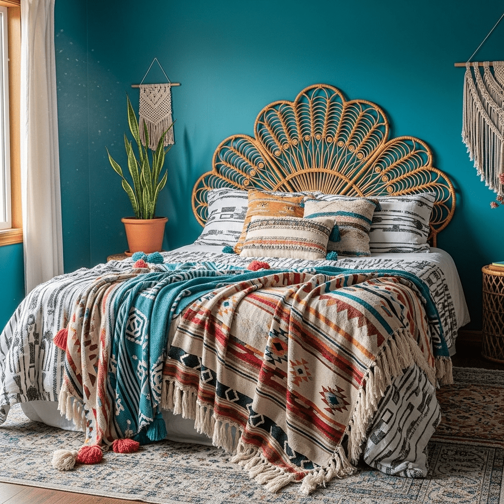 For a more energetic and global feel, use a rich teal. This shade bridges the gap between blue and green and looks stunning when paired with woven macramé, rattan, and terracotta accents.