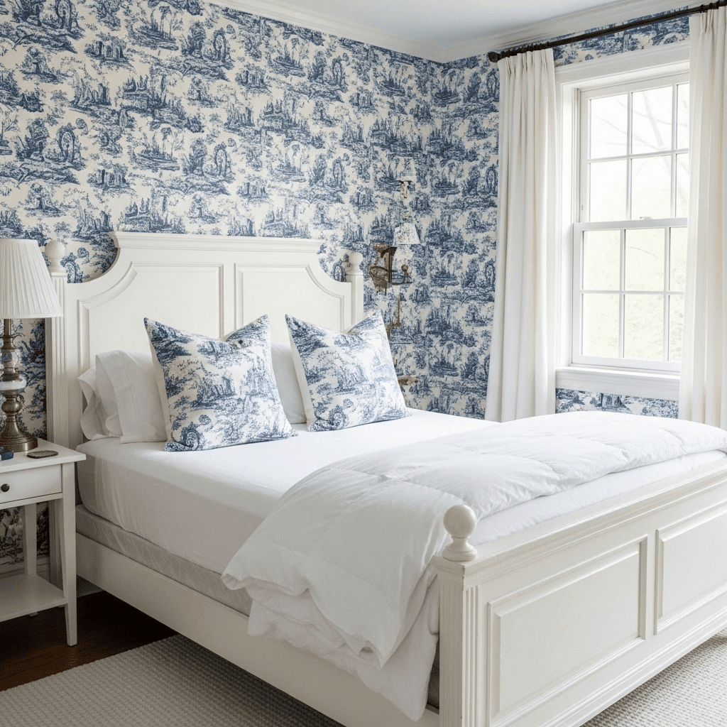 Incorporate blue through classic patterns like Toile de Jouy. Blue and white patterned wallpaper or bedding provides a timeless, vintage charm that makes a guest room feel like a cozy historical inn.