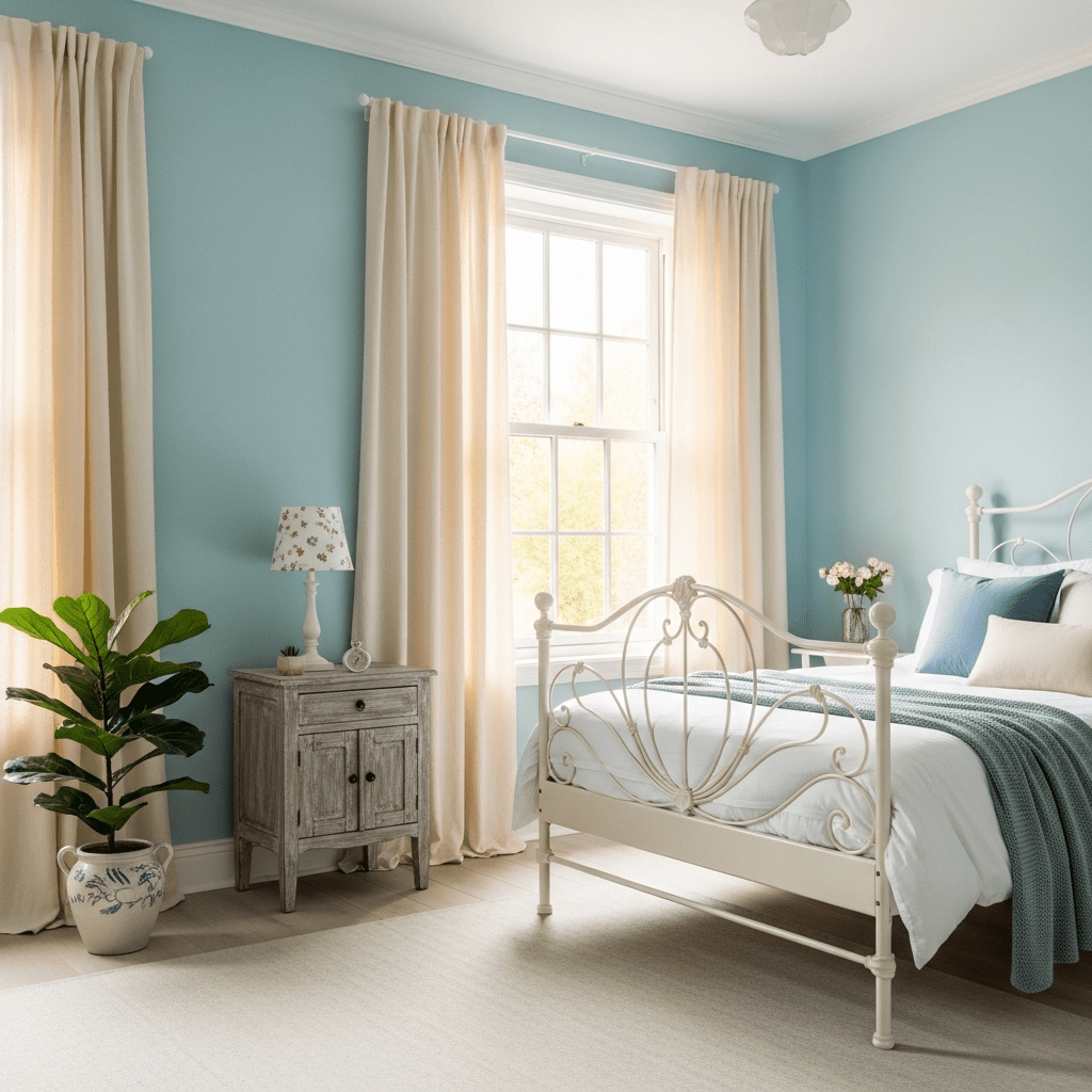 This design focuses on the lightest end of the spectrum. By using pale sky blue on the walls and matching it with sheer white fabrics, you create a room that feels like a breezy seaside cottage, even in the middle of a city.