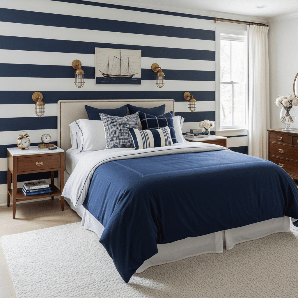 Embrace the maritime theme with bold navy and white horizontal stripes. This look is structured and clean, especially when accented with brass hardware and nautical-inspired lighting.