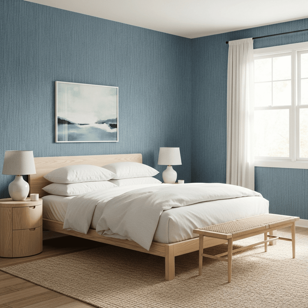 Using a blue grasscloth wallpaper adds a layer of sophisticated texture that paint cannot achieve. The subtle variations in the weave catch the light and add a high-end, tactile quality to the walls.