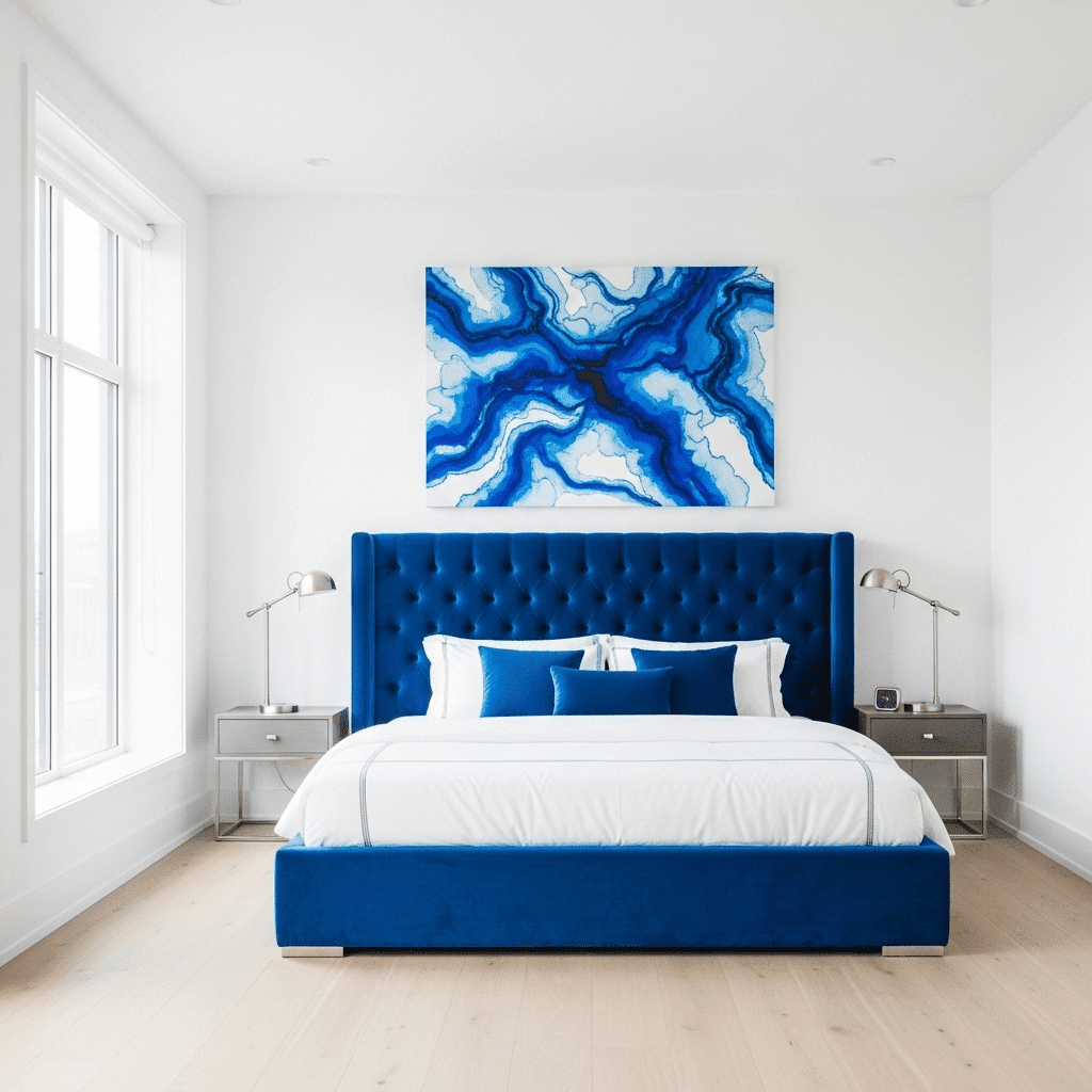 If you aren’t ready to commit to blue walls, keep the room a gallery white and use electric blue for the “pop.” A bold blue headboard or oversized artwork creates a high-contrast, contemporary look.