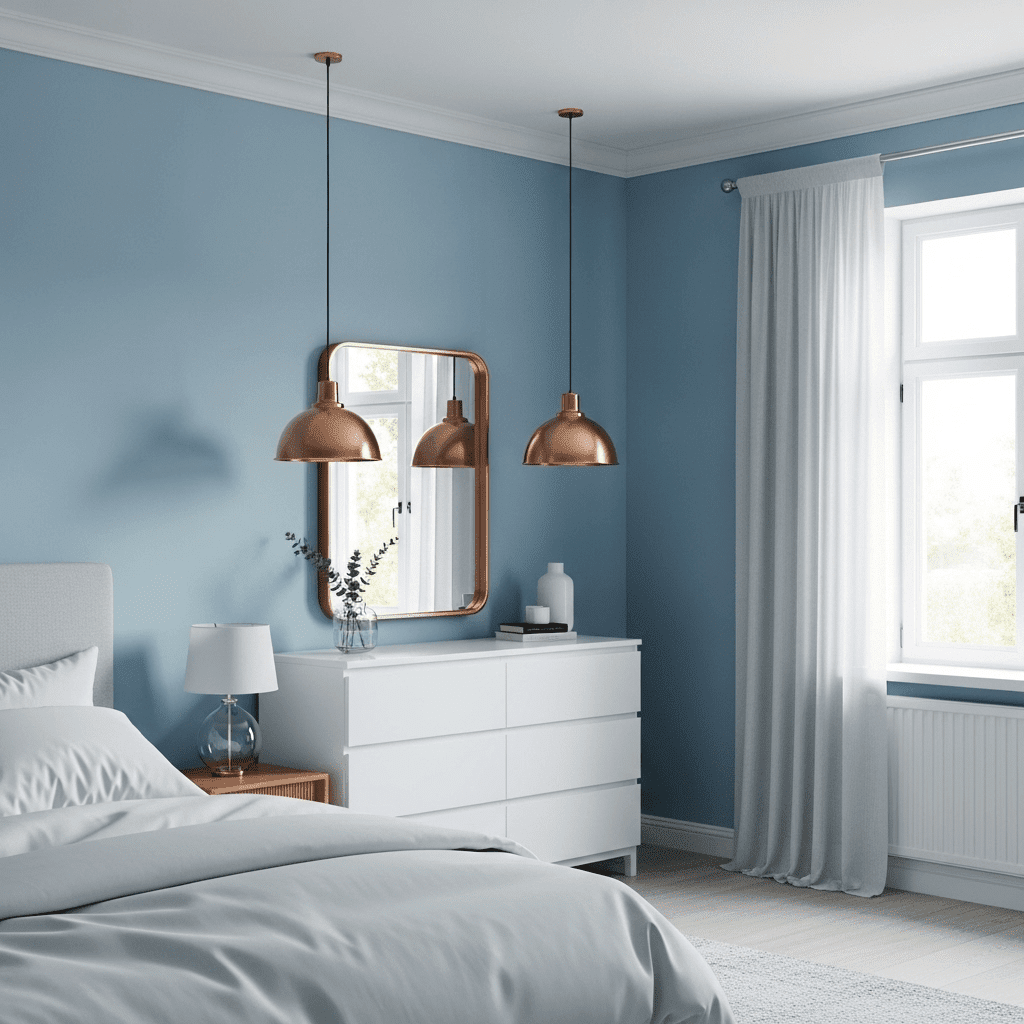 The coolness of powder blue is perfectly balanced by the “heat” of copper or rose gold. Use metallic light fixtures or frames to add a modern, glowing contrast to the soft blue walls.
