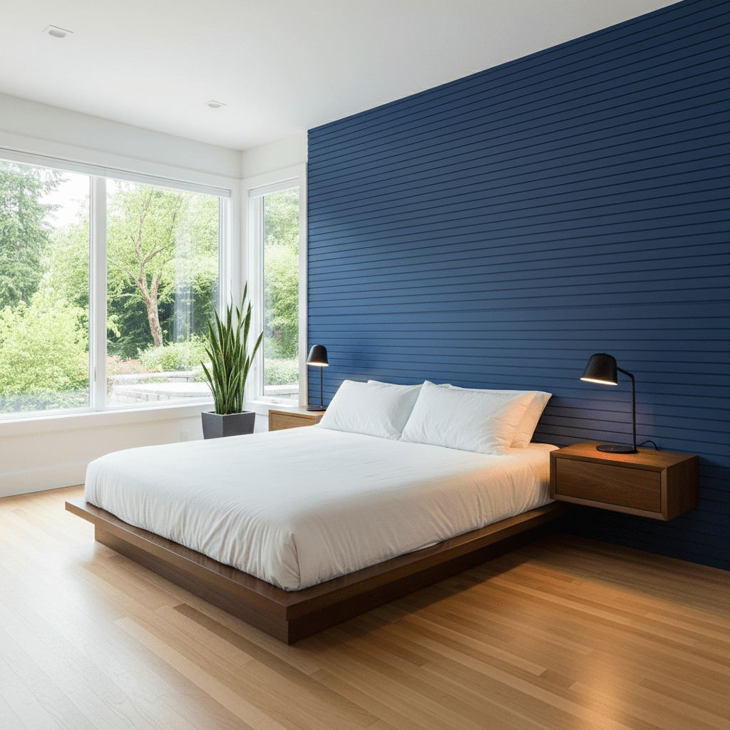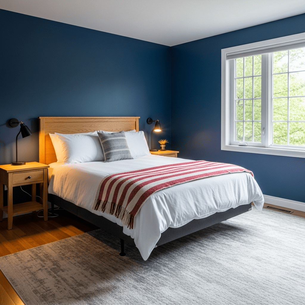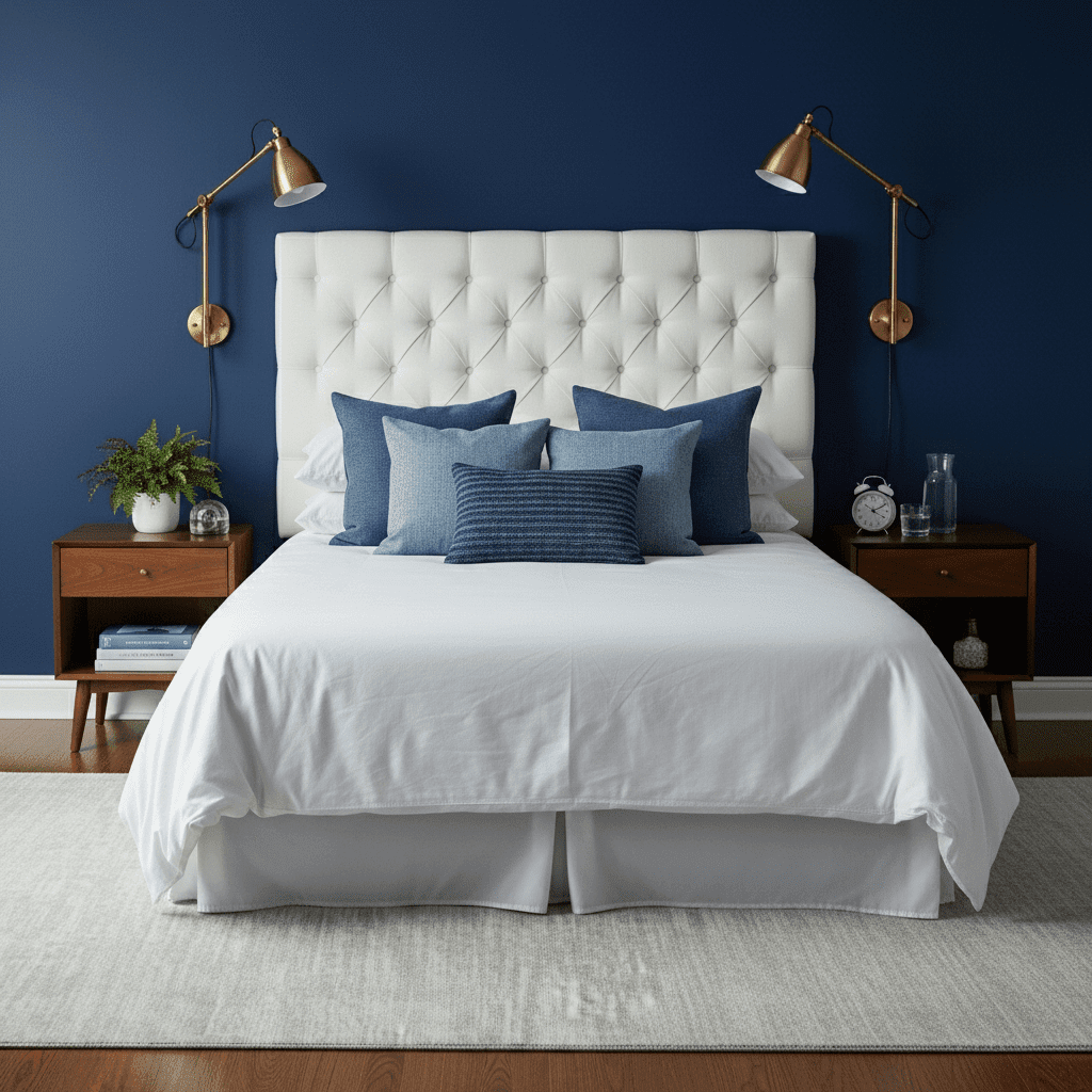 Navy blue creates a sophisticated, cocoon-like environment. Painting all four walls in a deep navy makes the bed feel like a safe, bright island, especially when paired with crisp white linens and polished brass accents.