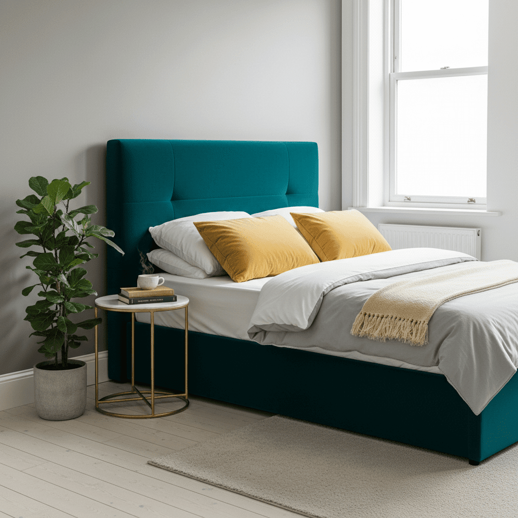 Teal offers a richer, greener take on blue that feels incredibly luxurious in velvet. A teal velvet headboard or armchair adds a jewel-toned depth that makes the guest room feel expensive and cozy.