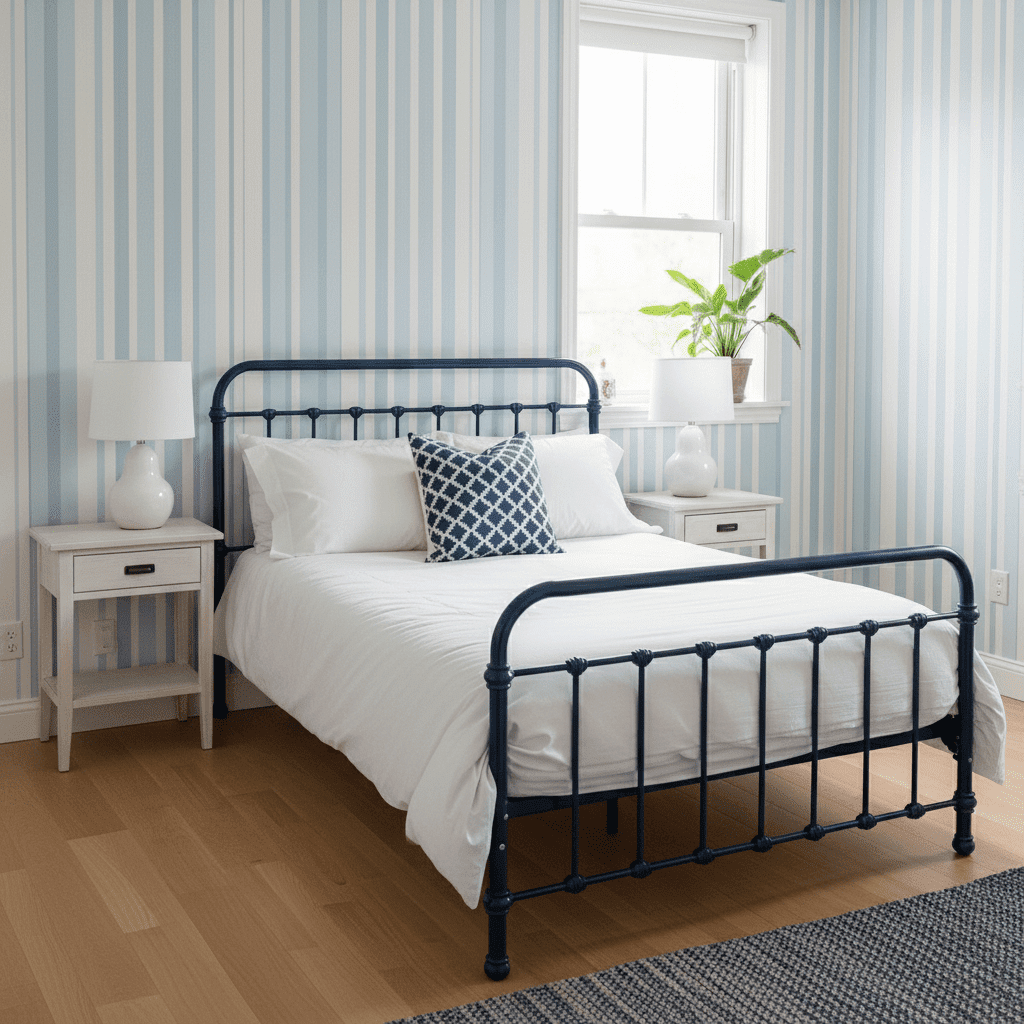 Blue and white vertical stripes are a design classic. They add a rhythmic, tailored quality to the walls that makes the ceiling feel higher and the room feel perpetually tidy and “preppy.”