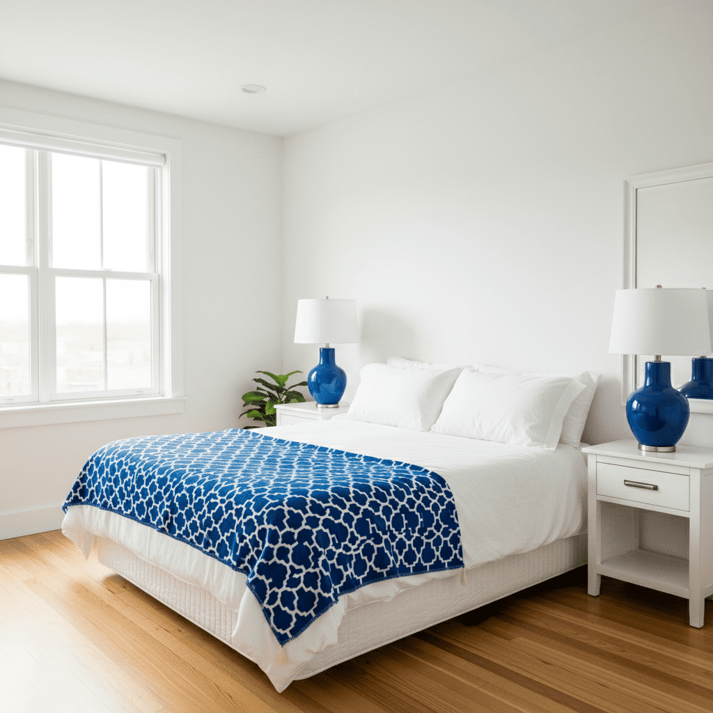Use a stark white room as your base and introduce pops of vibrant cobalt blue through textiles and ceramics. This high-contrast pairing feels energetic, clean, and reminiscent of a Greek island villa.