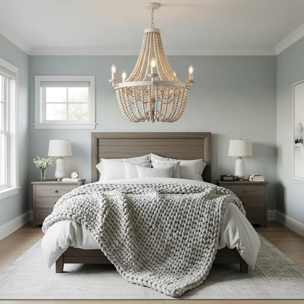 Swap out standard lighting for a chandelier made of wood beads or small sea shells. It filters light in a soft, dappled way, adding a romantic and textural element to the ceiling.