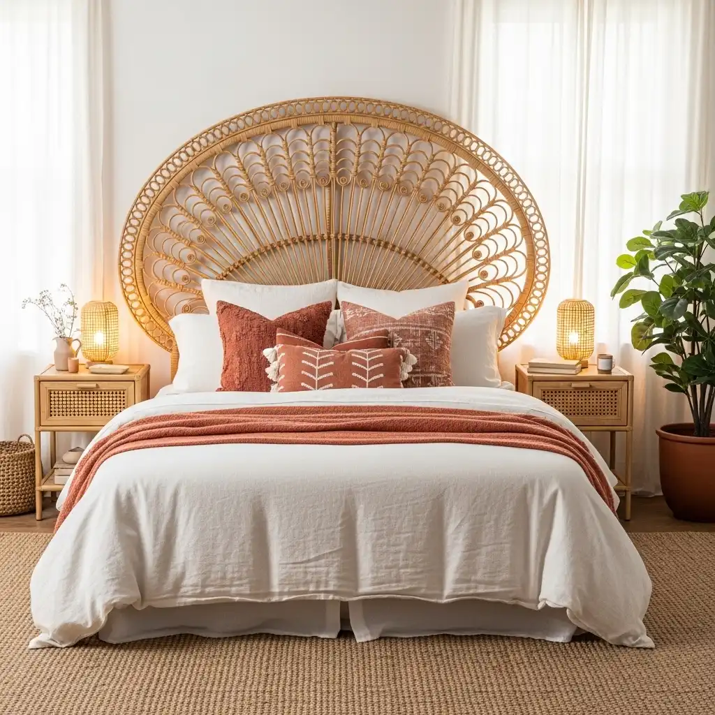 Anchor the room with an oversized, ornate rattan headboard. The intricate weaving adds an immediate architectural “wow” factor that feels handmade and vintage, providing the quintessential boho silhouette.