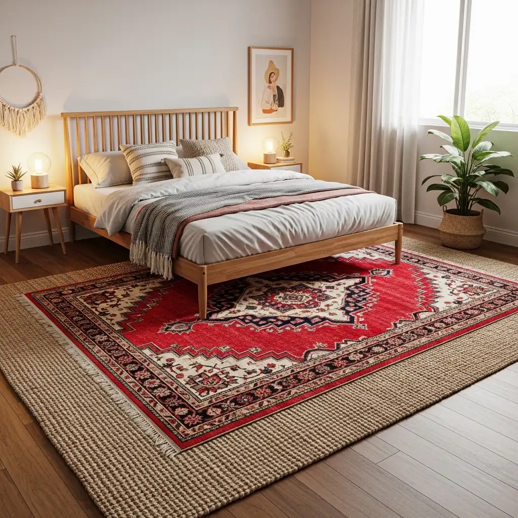 For ultimate underfoot texture, layer a colorful, distressed Persian-style rug over a larger, flat-weave jute rug. This “double-rug” technique adds warmth, depth, and a storied, traveled feel to the master suite.