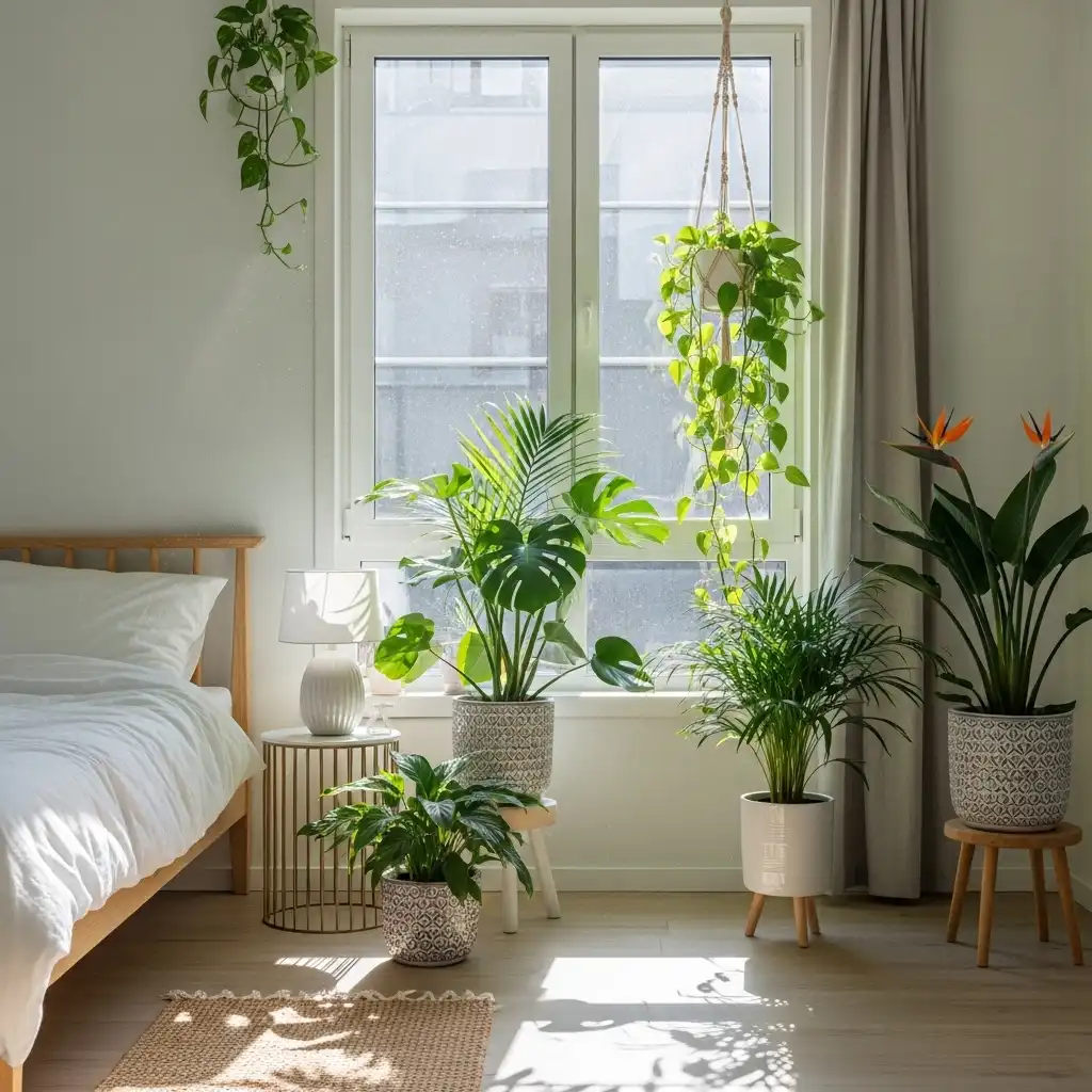 Incorporate nature by placing tall, leafy plants like Fiddle Leaf Figs or Bird of Paradise in the corners. Hanging Pothos from the ceiling creates a “living canopy” that purifies the air and adds vibrant, organic energy.