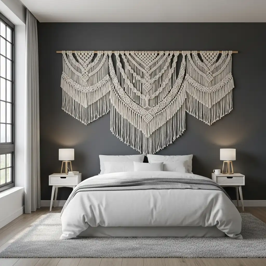 If you prefer a minimalist bed frame, use a massive, hand-knotted macramé wall hanging as your headboard. The soft fiber art adds incredible texture and a “human touch” to the back wall.