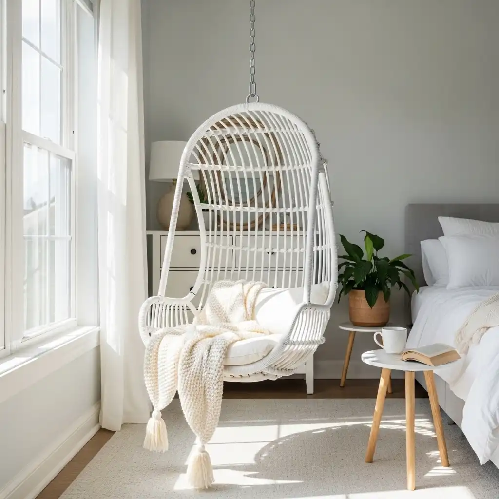 Add a playful, relaxed seating option with a ceiling-mounted rattan egg chair. Outfitted with a sheepskin rug and a kilim pillow, it becomes the ultimate private nook for reading.