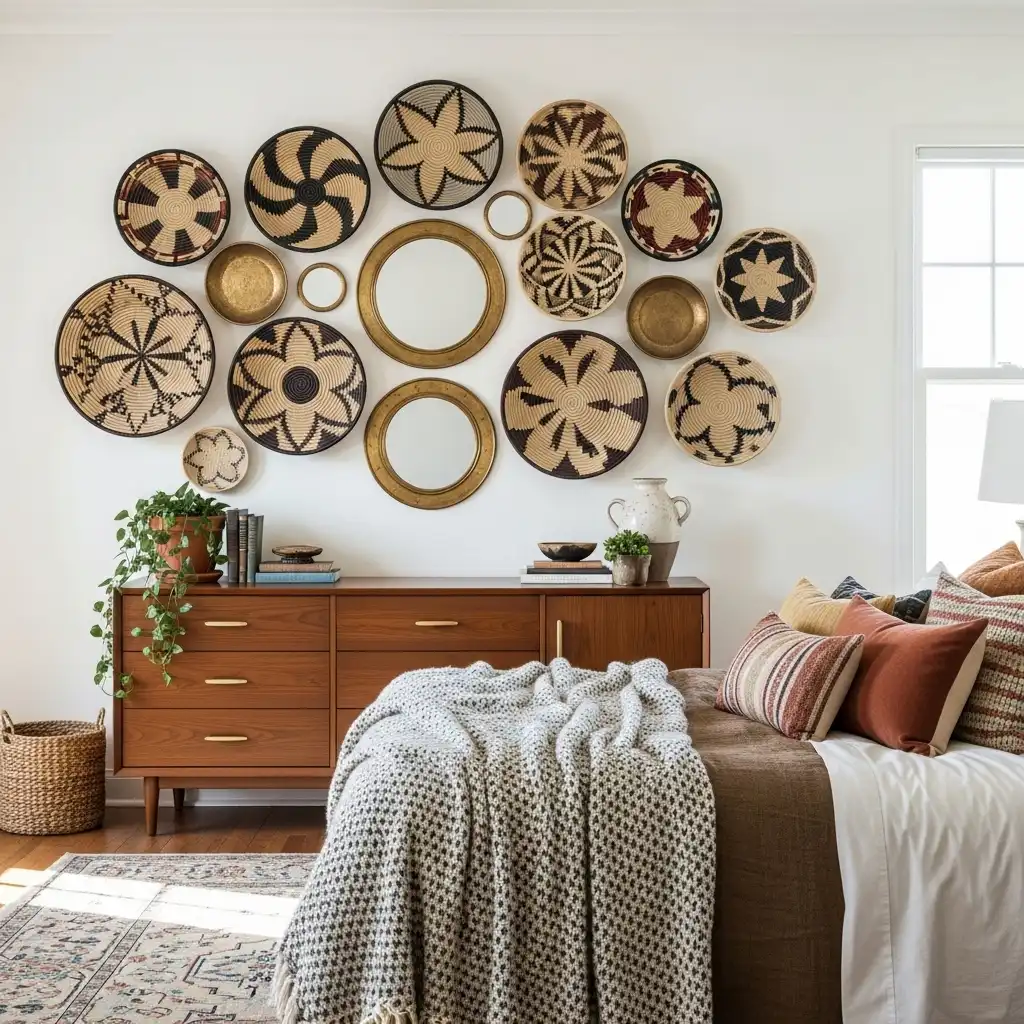 Display a collection of woven baskets, vintage mirrors, and travel sketches. Mixing shapes and materials on the wall reinforces the “collector” vibe that is central to bohemian living.