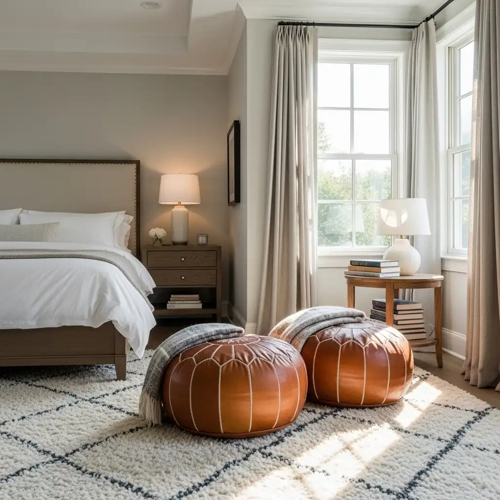Replace traditional armchairs with a pair of leather Moroccan poufs. They provide versatile, low-slung seating that keeps the room’s sightlines clear and the atmosphere informal.