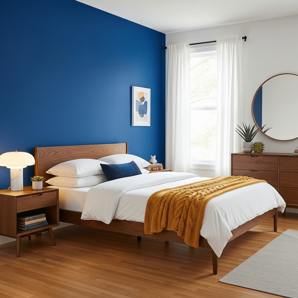 This high-contrast duo creates a modern, mid-century vibe. The coolness of a deep electric blue wall is perfectly balanced by the warmth of mustard yellow textiles, making the room feel balanced and vibrant.