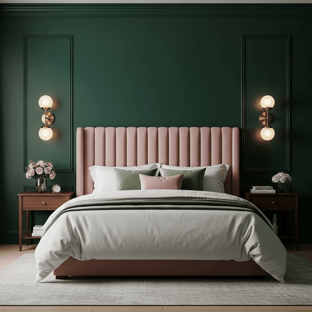 Emerald green provides a moody, luxurious foundation, while blush pink accents prevent the room from feeling too heavy. This “jewel and pastel” mix is sophisticated and trendy.